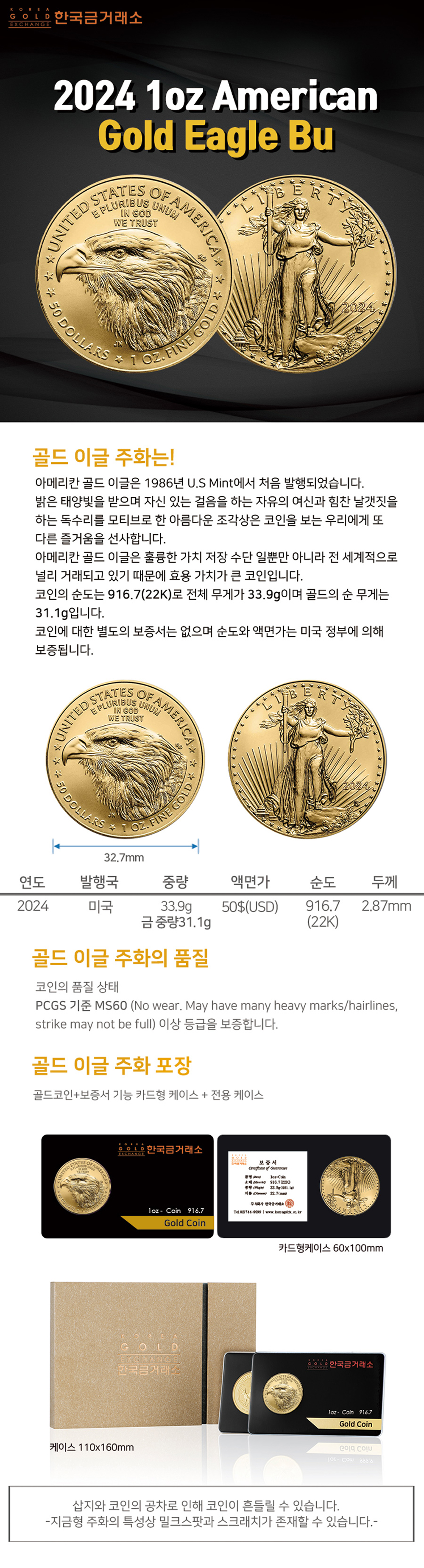 • 2024 1온스 아메리칸 골드 이글 불리온 주화(Coin) 50$(USD) - 22k